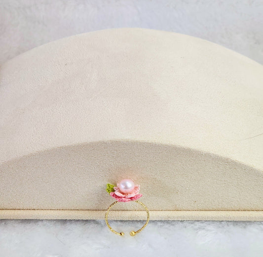 Lustrous Pearl & Peach Blossoms Micro-crochet Ring - Singular & Flawless Beauty