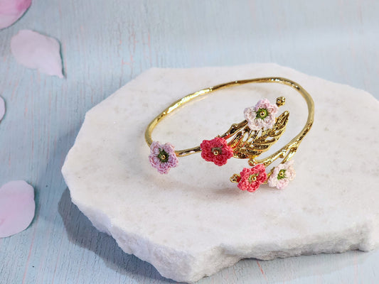 Apple Blossoms Micro-crochet Gold Leaf Bangle - Sculptural Comfort with Botanical Accents