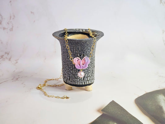 Micro-crochet Pink-Purple Butterfly with Pearl Heart Necklace