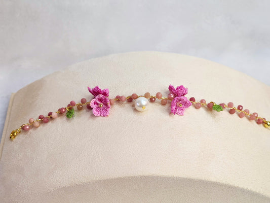 Rhodochrosite crystal & pearl bracelet with handcrafted micro-crochet peach blossoms for prosperity & luck. 14K gold-plated bracelet.