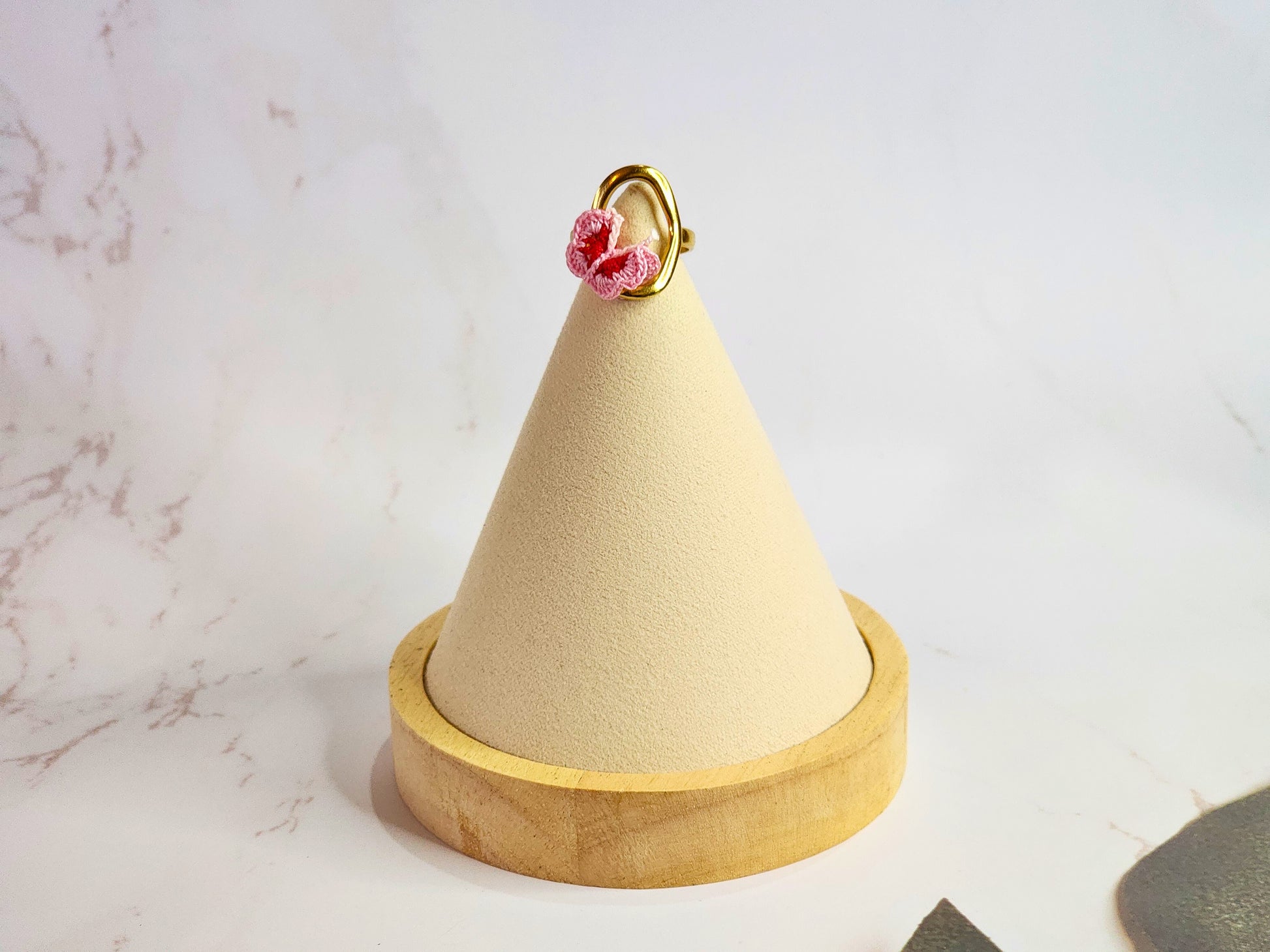 Add a pop of color and playful elegance to your look with our micro‑crochet Pink‑Red Butterfly ring. Crafted with ultra‑fine yarn for exquisite detail. Set on an 18K gold-plated stainless steel adjustable band.